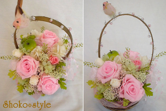 - 使用花:メディアナローズ、ヴェルテイッシモローズ、ビビアン、紫陽花、カスミ草、ケルカスオーク、フェイクアップル、小鳥、ビーズ、他